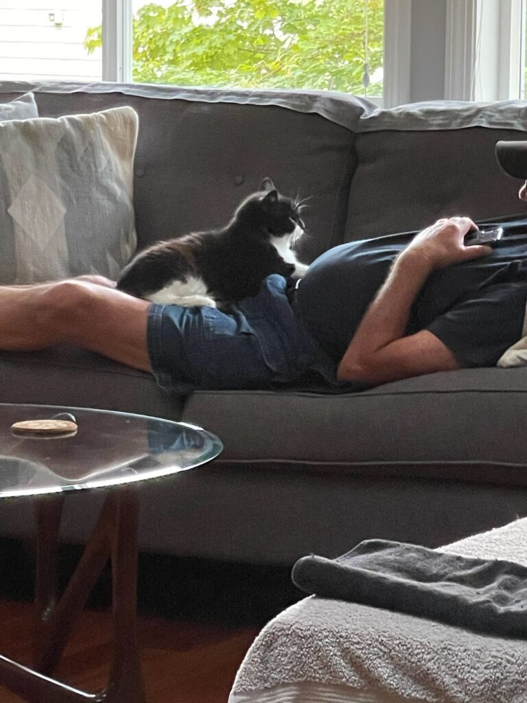 We always say there is a home for every cat – it’s a matter of finding it. Sometimes it takes longer than other times. Zoe came to us in 2016. Everyone loved her but she did have her quirks (don’t we all).CRAN was contacted after Zoe was surrendered to a local veterinary practice by her owners for euthanasia. Zoe is a great cat with a big personality but she had two challenging behaviors. She would go outside of the litter box and she would get over-stimulated and nip.Zoe was in several foster homes and ended up spending much of her time at our intake facility. She was a cheerful presence there and roamed freely around the open areas. Zoe loved pets until she didn’t. She was a sensitive cat and we needed to watch her carefully for cues that she was getting overstimulated and ready to nip the hand petting her. Multiple litters and litterboxes were tried with varying degrees of success. Finally, we found she liked puppy pads and the incidence of outside the box events dropped off sharply. She finally became consistent with peeing in the box with an occasional poop outside but near to the box. All the volunteers loved Zoe but we wondered if she would ever find a home for her senior years where she could be loved and appreciated for who she was.Finally, Zoe’s future people found her. They had previously adopted another senior kitty from us who had since passed away. Zoe joined them and it was not long before she was settled in and enjoying her new life. She is now a pampered, much-loved kitty and loves following her new dad around.