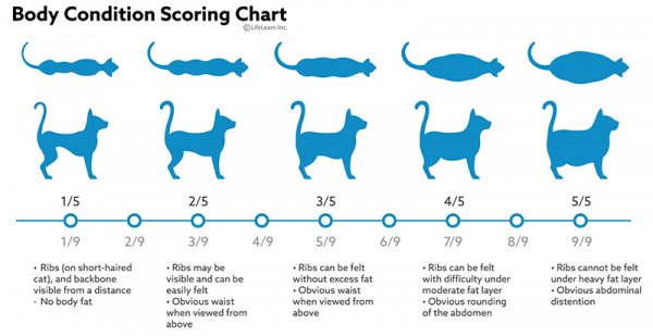 To assess the weight status of a cat, some veterinarians may use a nine-point scoring system, with score of 4.5 to 5 points indicating that an animal is at its ideal weight. A score of 9 would mean that a cat is grossly obese, while an emaciated, severely underweight cat would have a score of 1. Any cat that has a score above 6.5 or 7 would be classified as overweight, and a score of 8 or above would mean that the animal is severely overweight or obese.