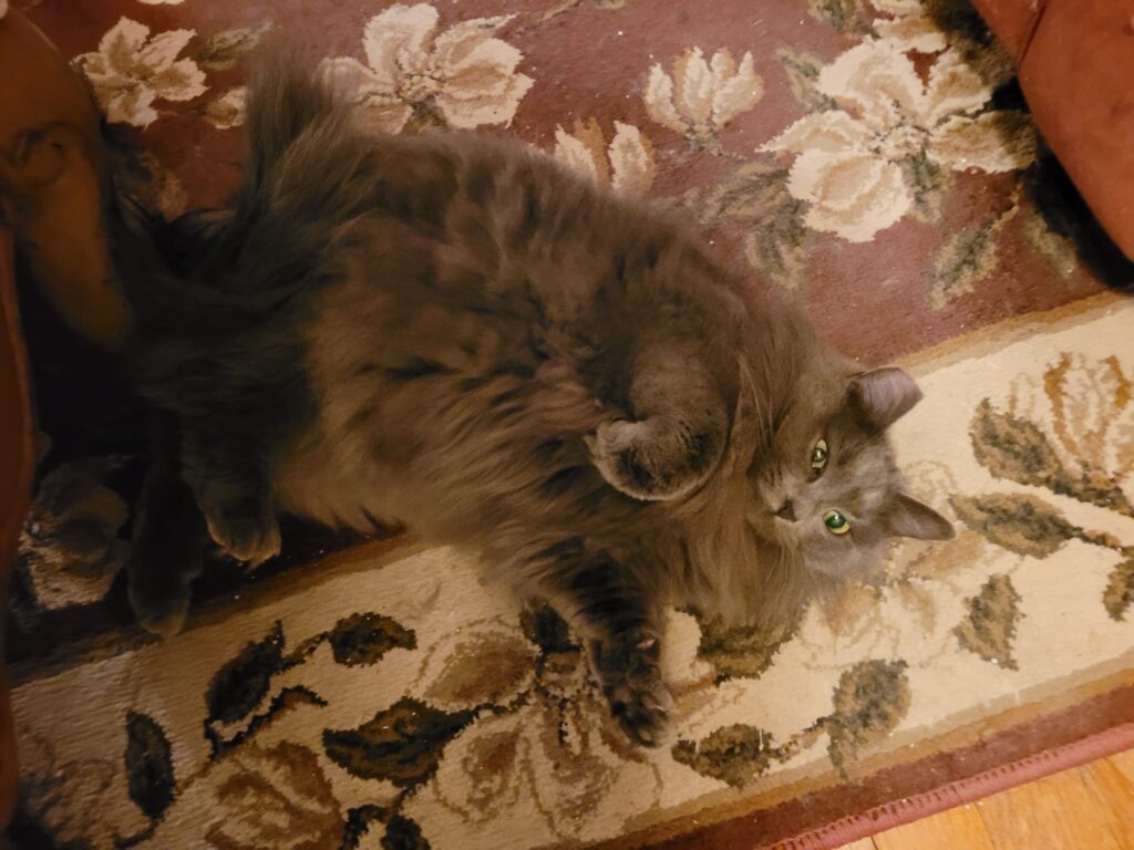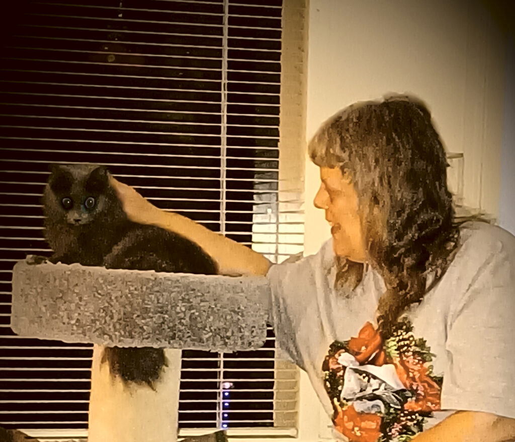 Awe was transferred to CRAN from the local humane society because she had become very fear-aggressive in the shelter setting. It took several months for Awe to decompress and learn to trust again but she did. From her adoptive mom:”Sweet Awe has added a new joyful dimension to my home and heart. I celebrate every baby step she takes towards feeling more secure and confident. I let Awe set the pace and encourage her with talking and singing to her, belly rubs, combing and brushing, and Churu treats.Awe is still afraid of anyone coming to the front door or inside and zooms to hide under the bed. She has graduated from being solely in the bedroom to having full rein around the house. It’s endearing to see Awe’s progress and that she has become my fur shadow joining me in whatever room I am in: rolling over and making air biscuits and purring.Awe loves watching the birds and squirrels outside our bedroom window, playing “catch and release” with catnip toys up and down the hall, and relaxing before bedtime listening to jazz piano with me swishing her tail to the music. I am so grateful for Awe’s prior foster mom who believed in her and patiently nurtured her from a traumatic history. This truly paved the way for Awe to transition to her forever home with me. I am delighted to be Awe’s cat mom, she’s a treasure!”